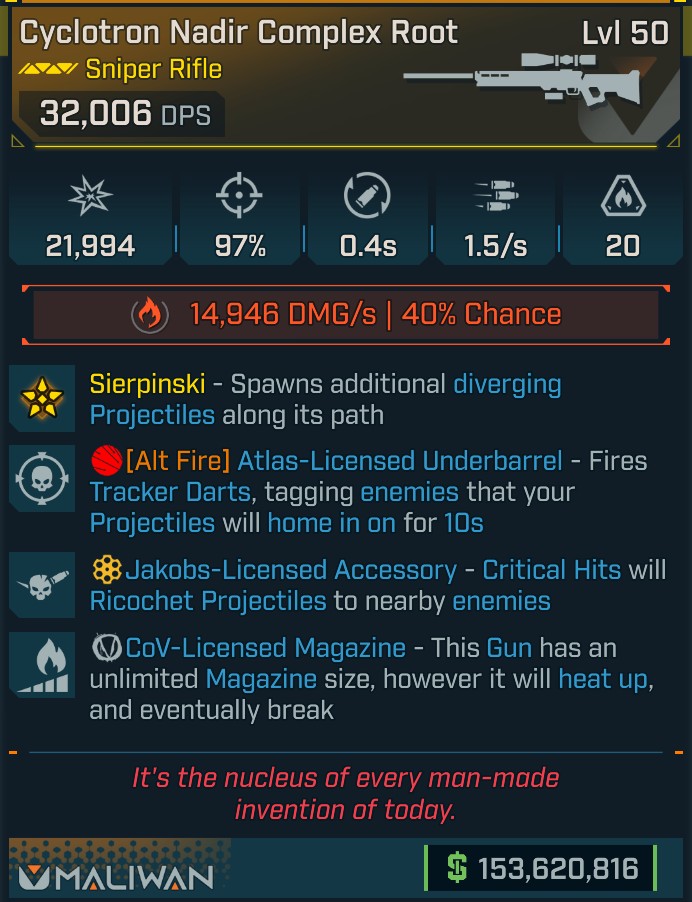 ⭐[MODDED] L50 COMPLEX ROOT - 32,006 DPS (+14.946 FIRE DMG/S) - 0.4s RELOAD - ATLAS UB - COV MAG⭐