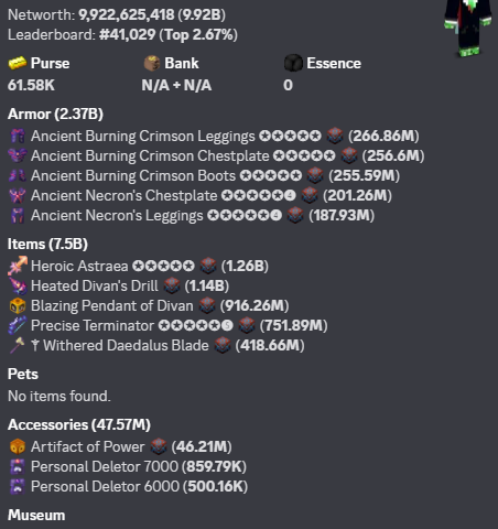 Includes items like Hyperion, Terminator, divans drill, Diamond/Golden Heads, Daggers, pendant of divan, 9* necron, burning crimson with habanero tactics v!