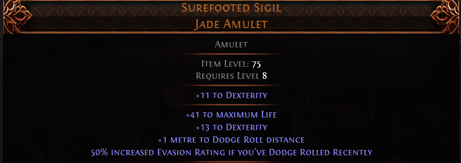 RISE OF THE ABYSSAL Surefooted Sigil UNIQUE AMULET LVL 8 REQ +1 METER ROLL DISTANCE AMULET DEX LIFE