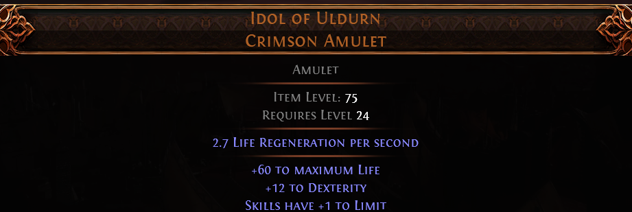 RISE OF THE ABYSS Idol of Uldurn UNIQUE AMULET LVL 24 REQ SKILLS HAVE +1 LIMIT MAX LIFE + DEX AMULET