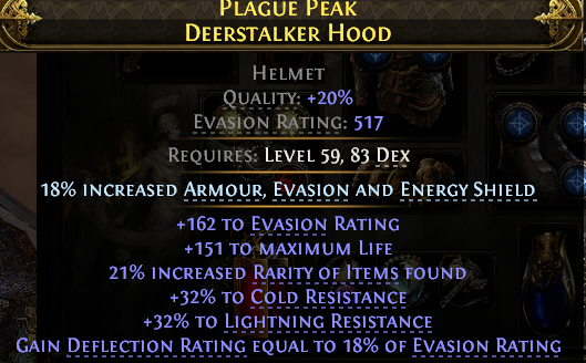 517 EVASION HELMET 151 LIFE 21% RARITY FOUND 32% COLD 32% LIGHTNING RESISTS 18% DEFLECTION DEADEYE R