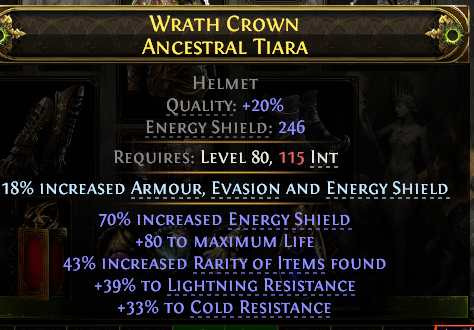 246 ENERGY SHIELD HELM 43% RARITY FOUND 80 LIFE 39% LIGHTNING 33% COLD RESIST WITCH SORC WARRIOR