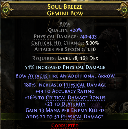 RISE OF THE ABYSSAL 493 MAX DMG GEMINI BOW FOR DEADEYE RANGER 23 DEX 16% CRIT DMG 13 MANA PER KILL
