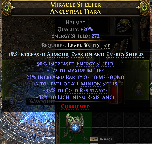 272 ES INFERNALIST MINION WITCH HELM +2 MINION SKILLS 172 LIFE 21 RARITY 35% COLD 32% LIGHT RES LICH