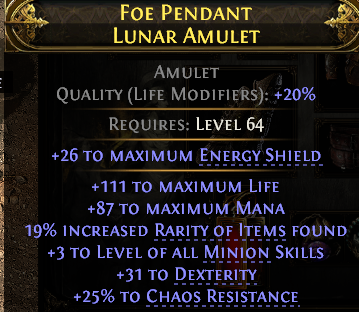 AMULET +3 LEVEL OF MINION SKILLS 111 LIFE 87 MANA 19% RARITY 31 DEX 25% CHAOS RES WITCH MINION LICH