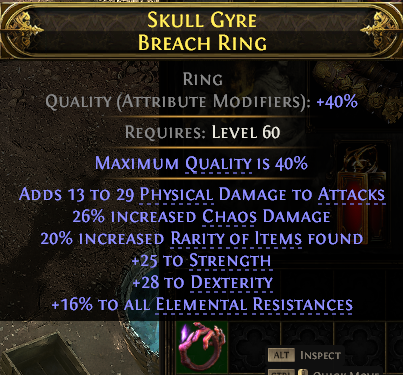 BREACH RING PHYSICAL DMG 26% CHAOS DMG 20% RARITY 25 STR 28 DEX 16% ALL RESISTANCES