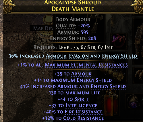 RISE OF THE ABYSSAL ARMOUR+ES CHEST 130 LIFE 44 SPIRIT 33 INT 40% FIRE 32% COLD RES +1 ALL MAX RES