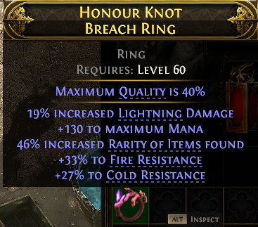 RISE OF THE ABYSSAL BREACH RING WITH 46% RARITY FOUND 19% LIGHTNING DMG 130 MANA 33% FIRE 27% COLD