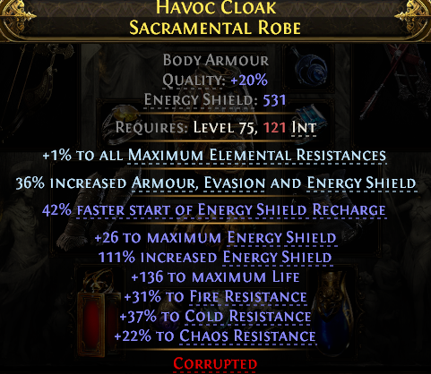 531 ENERGY SHIELD CHEST 136 LIFE 31% FIRE 37% COLD 22% CHAOS RESISTS SORCERESS WITCH CHEST