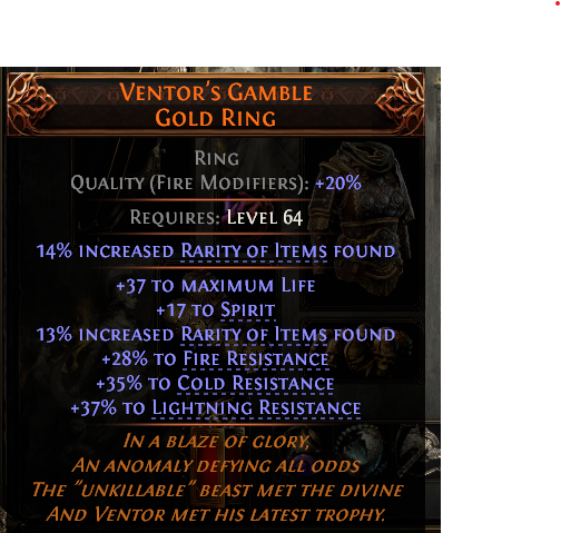 VENTOR'S GAMBLE 17 SPIRIT 37 LIFE 27% RARITY +28/35/38% RESISTANCES MINION WITCH RING LICH INFERNALI