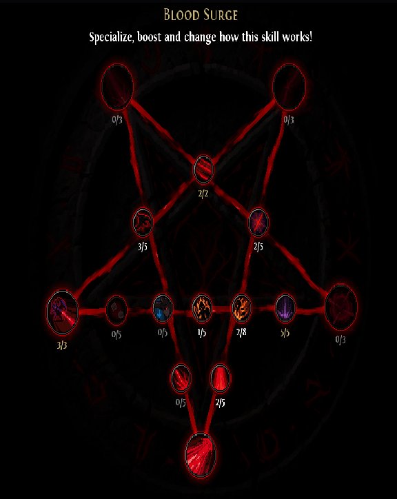 At that point, you transition into Blood Surge and begin following the more advanced Level 100 trees shown below. For your attributes, it is recommended to split points between Vitality and Intelligence fairly evenly early on, as this gives you a much more comfortable balance between damage and survivability. Later, once you enter end-game and acquire stronger equipment, you should move fully into Intelligence, as high-tier gear will provide enough Life and defense on its own.