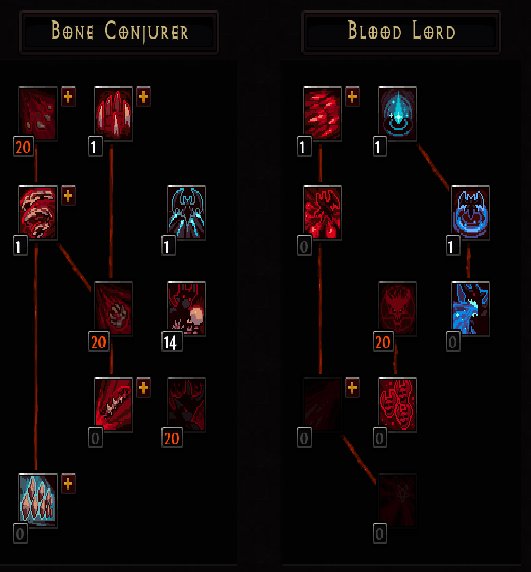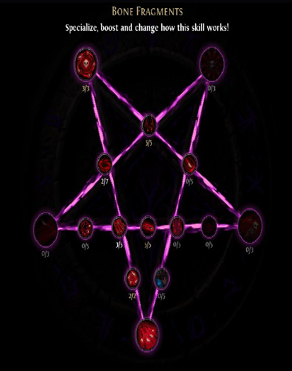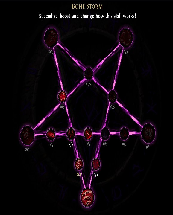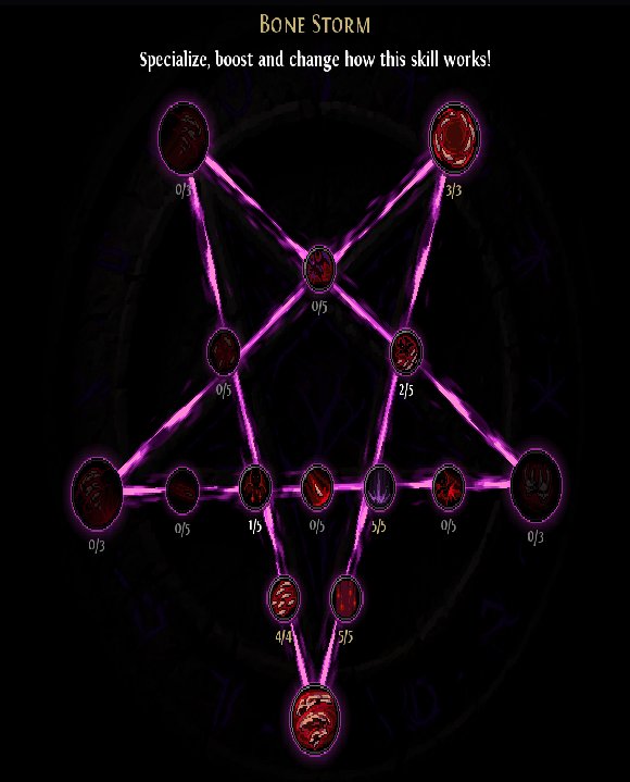You can start leveling with almost any early skill, but Impale or Blood Bolts are the most convenient options before your core setup becomes available. As soon as you unlock Bone Storm, you should switch to it immediately and refund the points invested into your previous leveling skill. Bone Storm offers much better coverage, smoother clear, and greatly improved overall tempo during the early game, which makes it the natural choice until around Level 40.