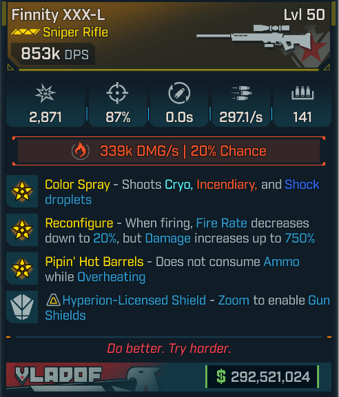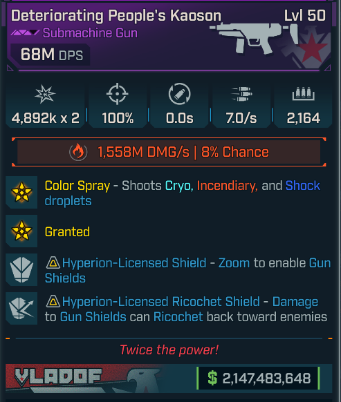 ◉ Panicking Hellwalker (Shotgun) — 10-pellet nuke with multi-element procs; stupidly high burst DPS for instant room wipes. ◉ People’s Kaoson (SMG) — Laser-accurate hose with insane DoT (~1.5B/s) + auto Gun Shield/ricochets; melts bosses and mobs. ◉ Finnity XXX-L (Sniper) — Ramps to +750% damage and fires free while overheated; effortless one-shots. ◉ Adaptive Oscar Mike Shield — High-Capacity — Massive capacity + Overshield, +50% first-half-mag damage, bullet absorb; near-unkillable. ◉ Adaptive Oscar Mike Shield — Fast-Recharge/Execute — Quick recharge + Overshield, +50% early-mag damage, +30% execute vs <30% HP; aggressive DPS. ◉ Shielded Oscar Mike — Siren Class Mod — Lifesteal feeds Shields/Overshield, +50% first-half-mag damage with big gun/crit rolls; huge sustained DPS. ◉ San Saba “Songbird” (Pistol) — +100% damage for 5s after swap, homing orbs on reload, explosive gyrojets; burst eraser.