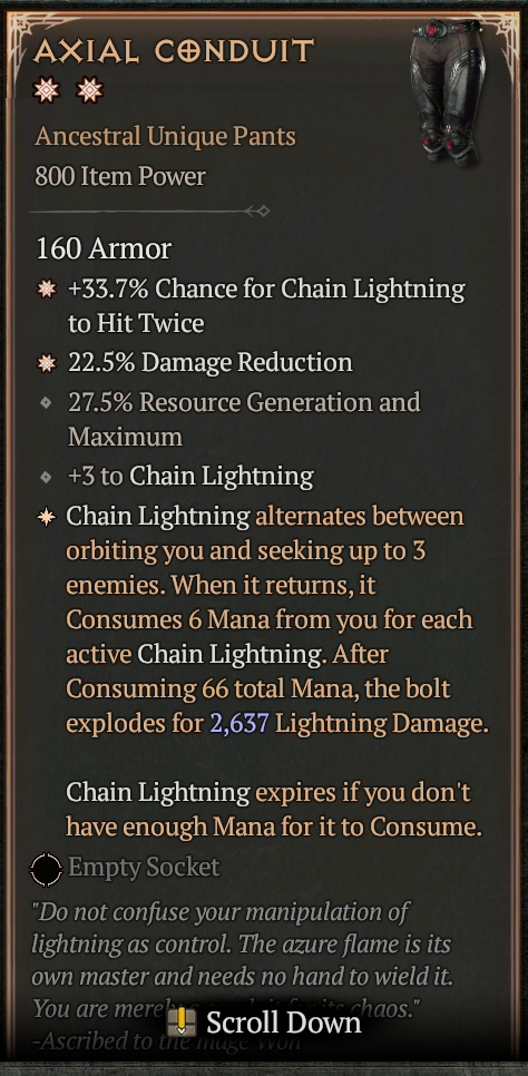 High-roll Axial Conduit with +33.7% chance to hit twice, +22.5% Damage Reduction, +27.5% Resource Gen/Max, and +3 to Chain Lightning.