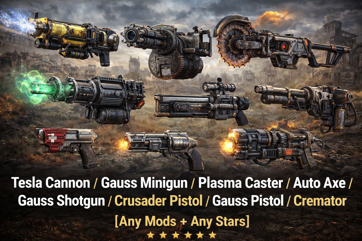 Gauss Minigun/Tesla Cannon/Plasma Caster/Auto Axe/Gauss Shotgun/Crusader Pistol/Gauss Pistol/Cremato