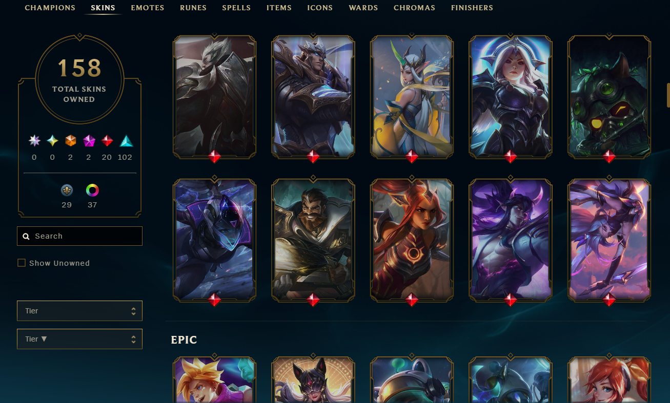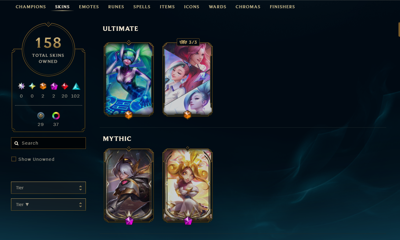 EUW/158 Skins/2 Ultimate/2 Mythic/20 Legendary/Bronze 1/ All champions