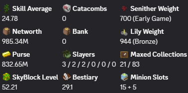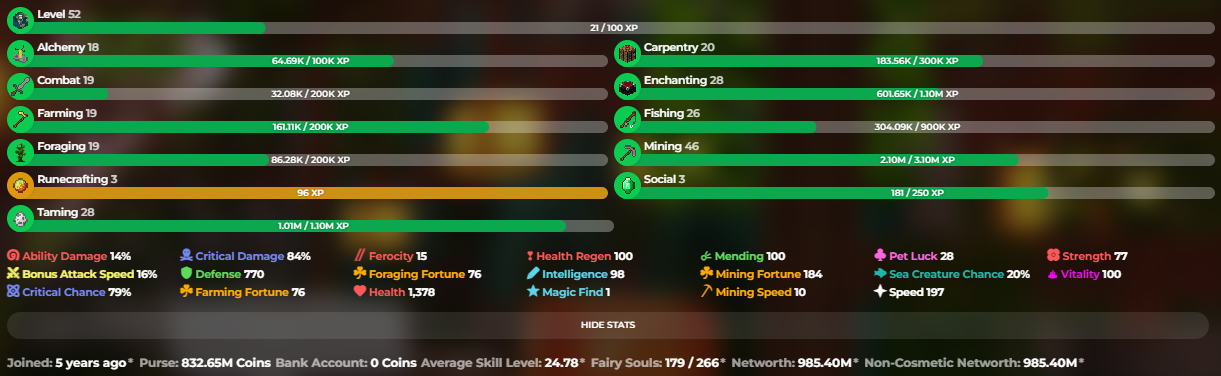 ✅❗️Solo-Coop | None | 52 SB lvl | 24.78 AVG | Cata 0 | 985.41M NW | Full accept | Hypixel SkyBlock❗️✅