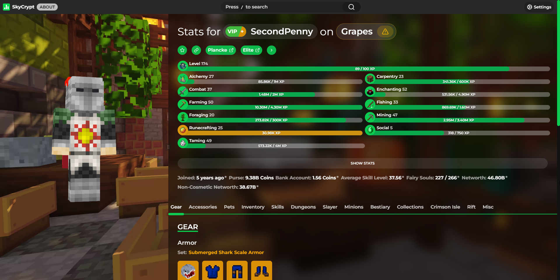 Detailed statistics - https://sky.shiiyu.moe/stats/SecondPenny/Grapes#Gear ⚡