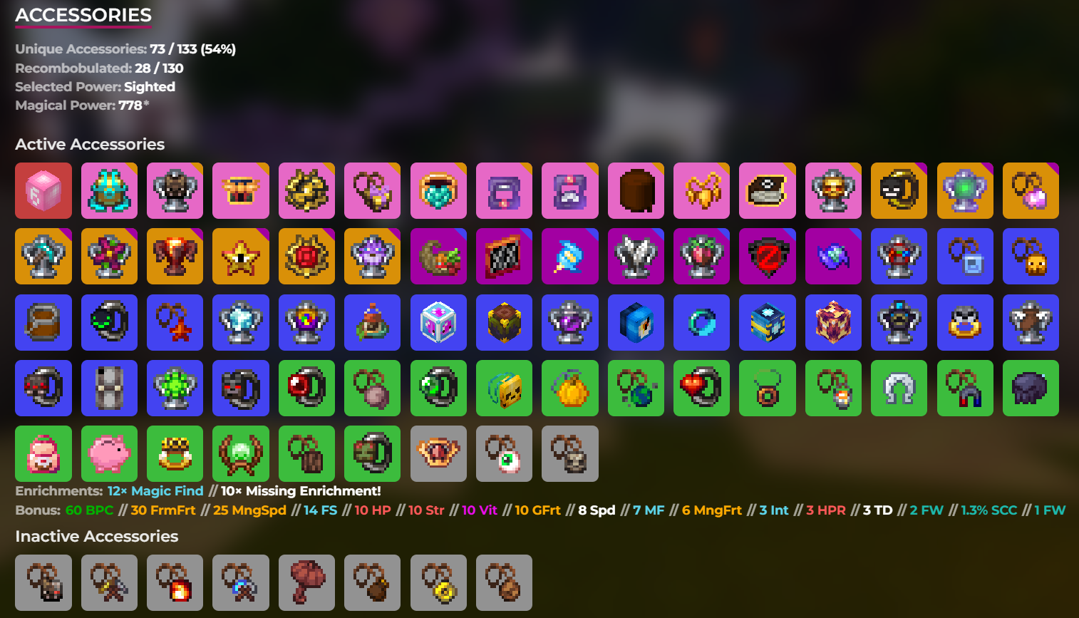 • Mythic Heroic Hyperion w/ Wither Impact, 5 Wither Stars, Ult Wise v, Many Enchants + Full Maxed Necrotic Fiery Aurora Set w/ Widsom V, g6 p6, Many Enchants + Mythic Necrotic Storms Set w/ Wisdom V, 5 Wither Stars, Portal Dyed, Many Enchants