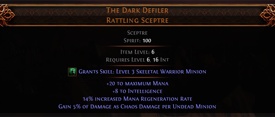 RISE OF THE ABYSS The Dark Defiler Rattling Sceptre UNIQUE SCEPTRE LVL 6 REQ WITCH WEAPON MINION