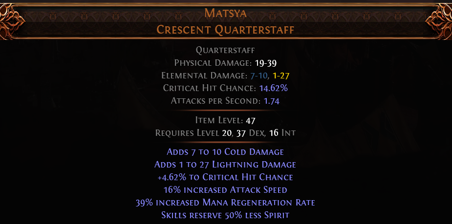 RISE OF THE ABYSS Matsya UNIQUE QUARTERSTAFF LVL 20 REQ MONK WEAON MONK STAFF SKILLS RESERVE 50% LES