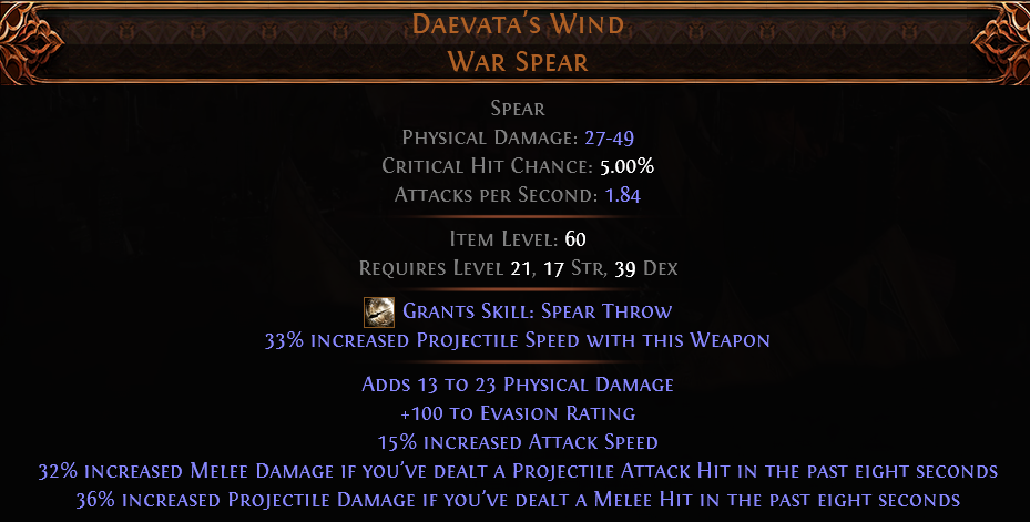 RISE OF THE ABYSSAL Daevata's Wind War Spear UNIQUE SPEAR LVL 21 REQ HUNTRESS WEAPON AMAZON WEAPON