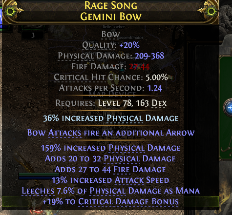 410 DPS GEMINI BOW 13% ATTACK SPEED 44 FIRE DMG 19 CRIT DMG BONUS MANA LEECH DEADEYE LIGHTNING ARROW