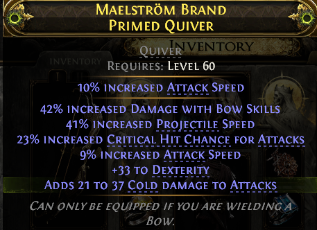 QUIVER HIGH COLD DMG 42% BOW SKILLS DMG 41% PROJECTILE SPEED 19% ATTACK SPEED 33 DEX 23 CRIT CHANCE