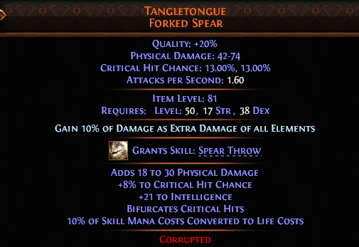 PERFECT 2 SOCKET 20% QUALITY TANGLETONGUE PERF 8% CRITICAL HIT CHANCE DEADEYE SPEAR LIGHTNING SPEAR