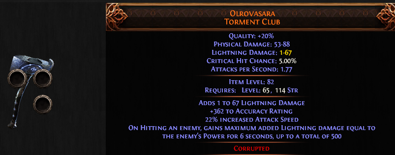 3 SOCKETED 20% QUALITY OLROVASARA TORMENT CLUB LVL 65 REQ Lazy's Molten Blast WEAPON