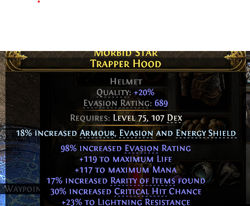 689 EVASION HELM 119 LIFE 117 MANA 17% RARITY 30% CRIT CHANCE 21% LIGHT RES RANGER HUNTRESS MERC