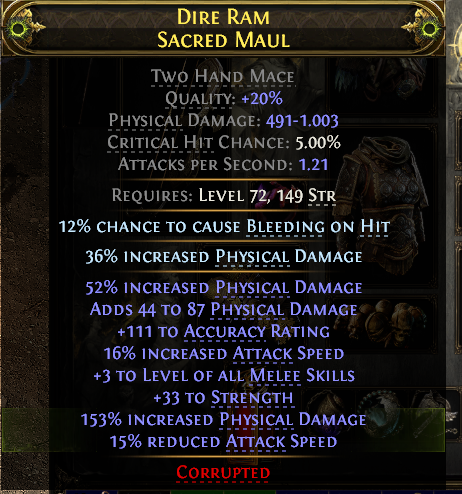 BONESHATTER WARRIOR SACRED MAUL 1003 MAX DMG +3 MELEE SKILLS 33 STR 16% A.SPEED SMITH OF KITAVA