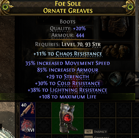 444 ARMOUR 35% MOV SPEED 29 STR 30% COLD 38% LIGHT 108 LIFE BONESHATTER SMITH OF KITAVA WARRIOR BOOT