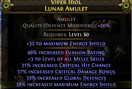 FALLING THUNDER MONK AMULET +3 MELEE SKILLS 46 EVASION 38 E.SHIELD 31 CRIT CHANCE 37 CRIT DMG 33 G.D