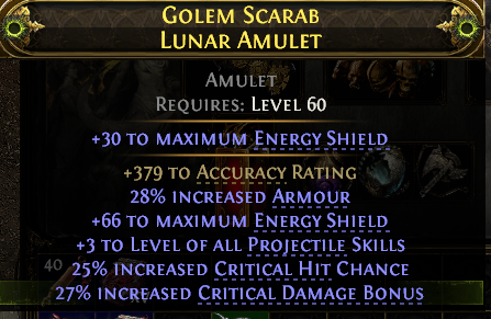 AMULET +3 PROJ SKILLS 25% CRIT CHANCE 27% CRIT DMG BONUS 379 ACCURACY RATING 96 E.S Galvanic Shards